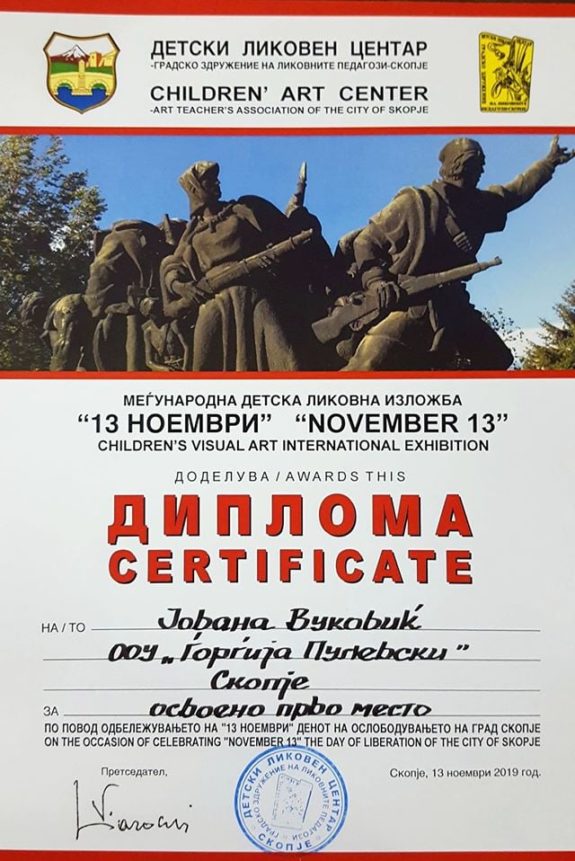 На традиционалната меѓународна ликовна изложба за деца и младинци посветена на празникот на градот Скопје – 13 Ноември, ученичката Јована Вуковиќ од VIII-4 одделение освои прво место за ликовната творба.